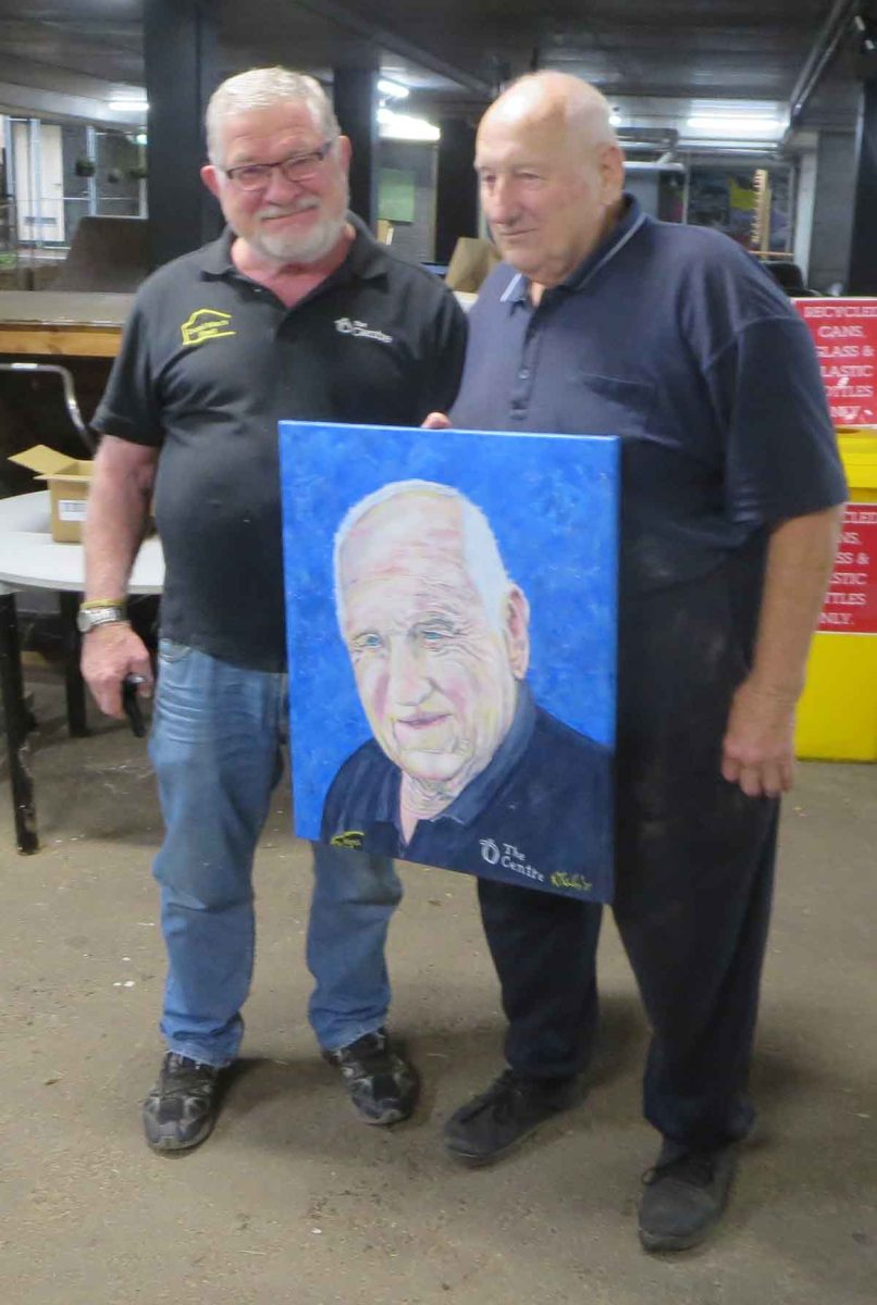 IMG_0924cw Published 19 March, 2021 at 1200 × 1787 in Gallery ← Previous Next → Ray Scully presents Ron Cowie with his portrait in appreciation for continuous dedication to the Shed